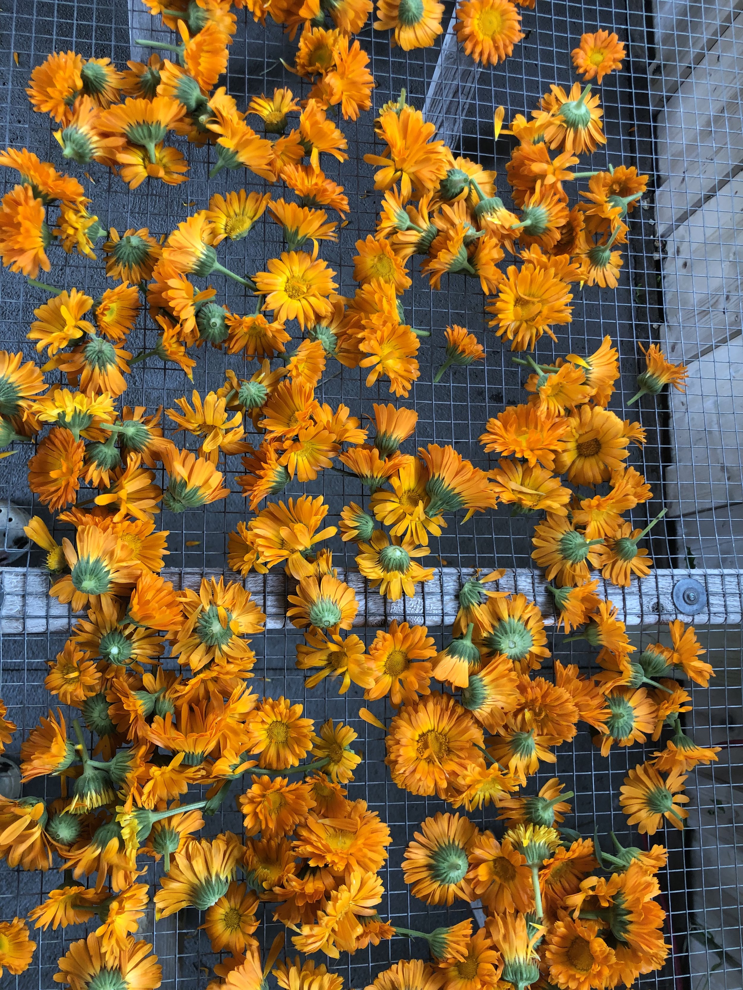 2023, was the first year I made my own calendula oil from the flowers I grew here at the farm. I grew a 100ft bed containing 300 calendula plants, dried them and eventually infused them with organic olive oil. I experimented by adding essential oils to get the right scent, plus jojoba oil for extra moisturizing effects and vitamin E, bottled them up and gave them out to twenty of my closest friends. I wanted those close to me to have a chance to spend some time with the oil, use it, and share back. My sister Amy said she puts the oil on her neck and chest when it is red or irritated, another friend said a rash on her hip was eliminated after using the oil, others simply enjoyed the scent and soothing nature of the golden oil. Any simple google search will tell you that calendula reduces inflammation (redness in skin), that it moisturizes, can be a stress reliever, and is especially good for sensitive skin. For myself, I use it every day, on my face and body as a soothing, moisturizing balm.